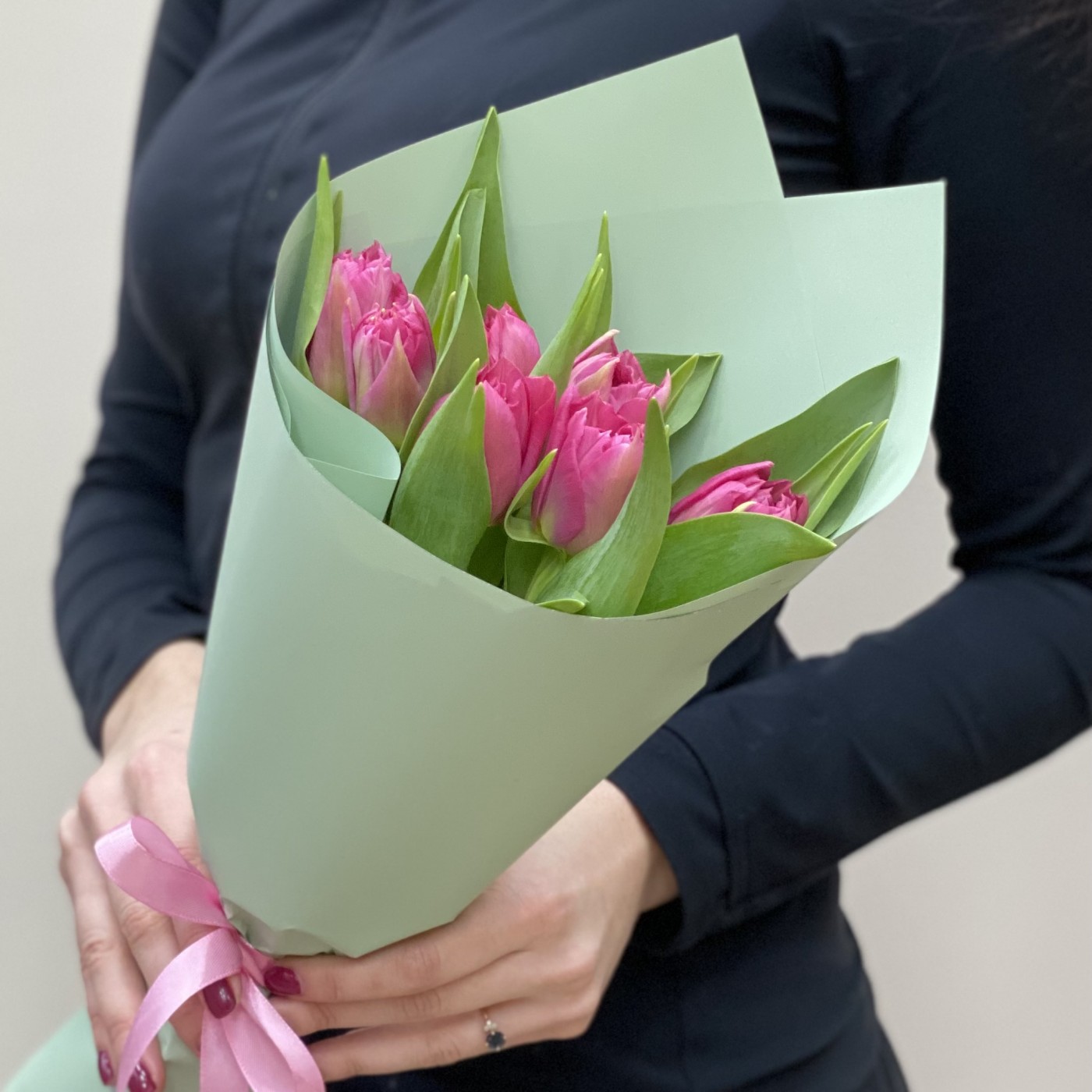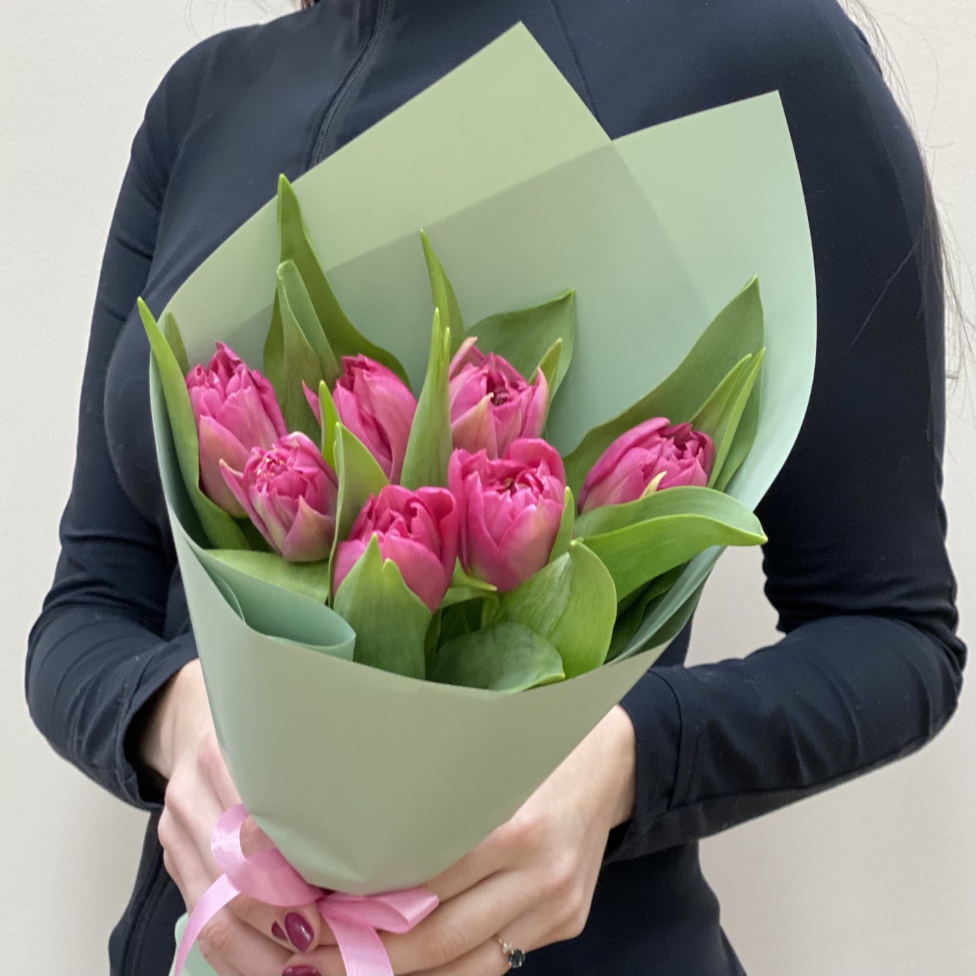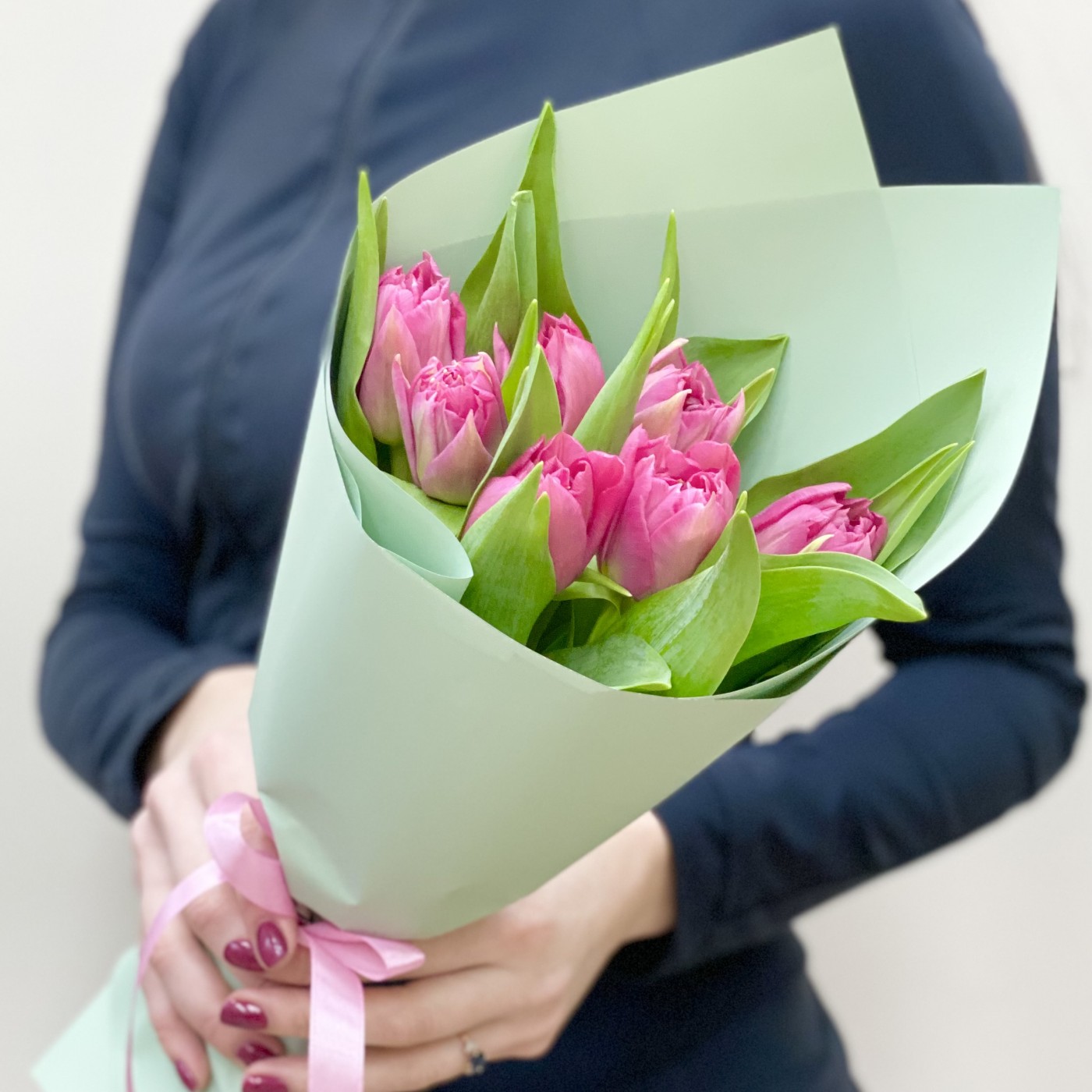 Небольшой букет комплимент из 7 розовых тюльпанов. Прекрасное дополнение к конфетам и подарку на 8 марта или любое другое торжество.