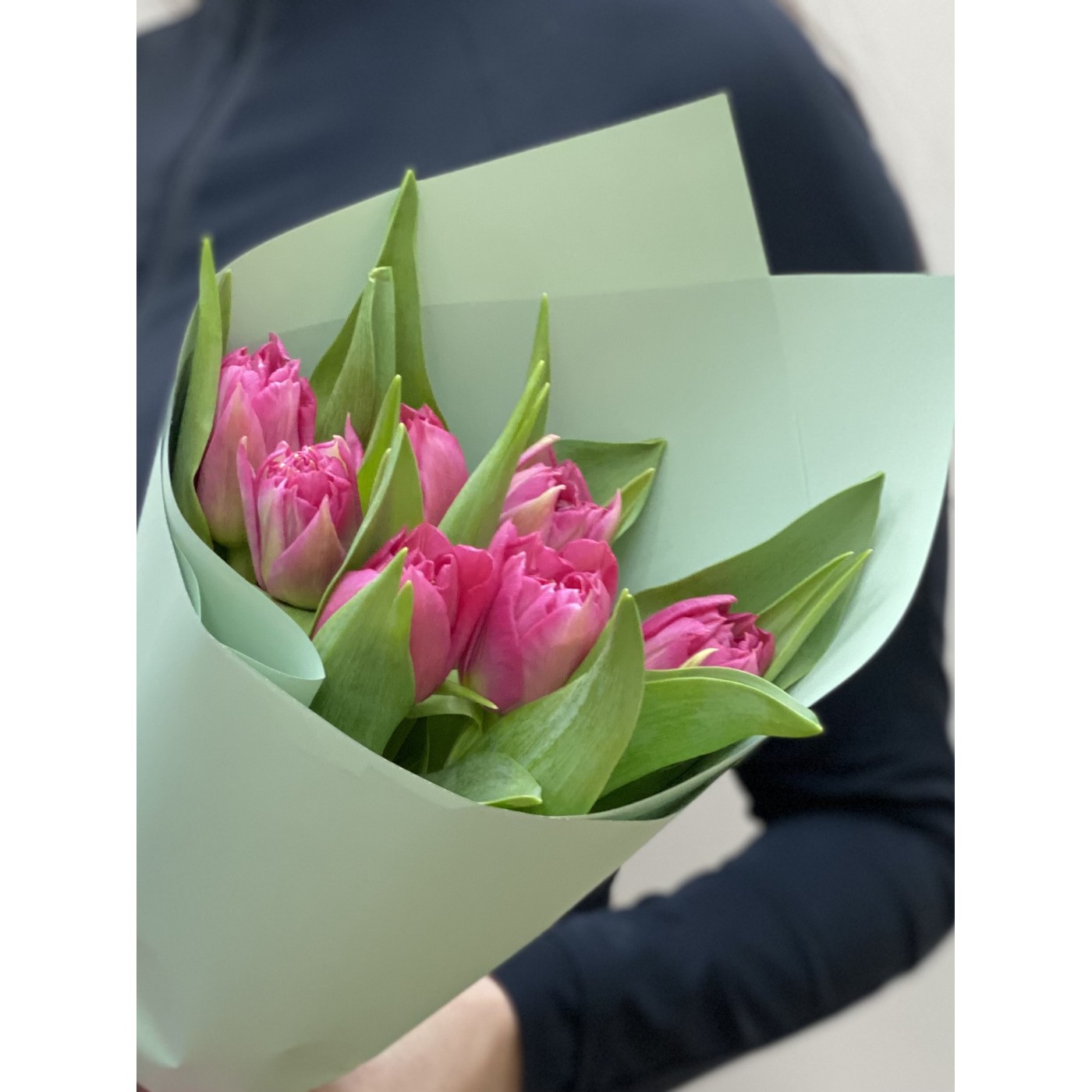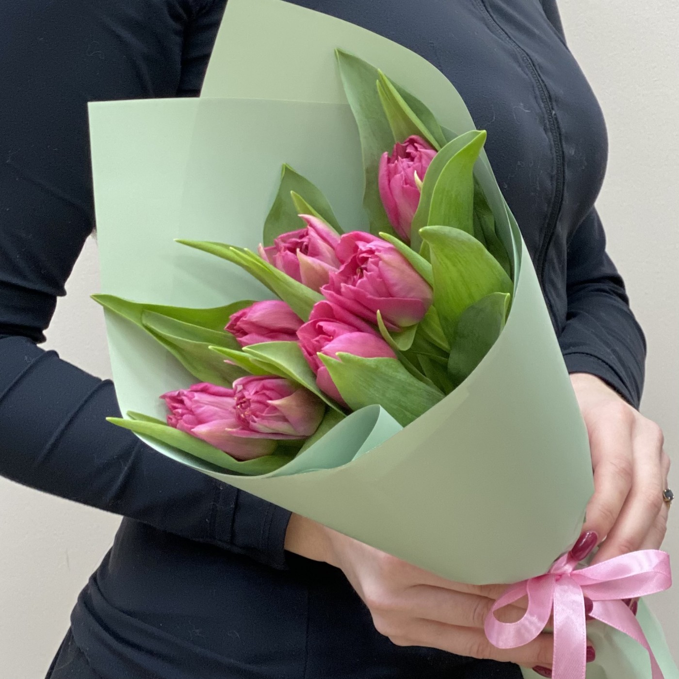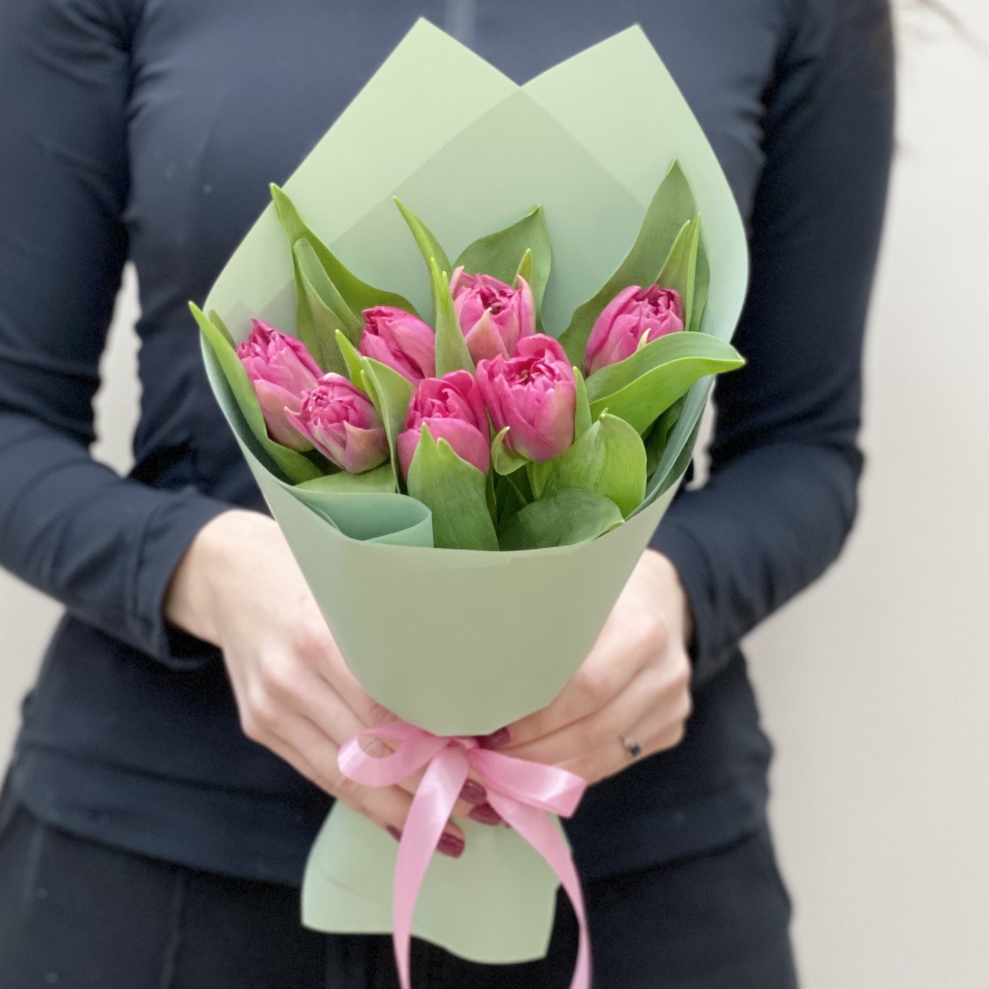 Небольшой букет комплимент из 7 розовых тюльпанов. Прекрасное дополнение к конфетам и подарку на 8 марта или любое другое торжество.